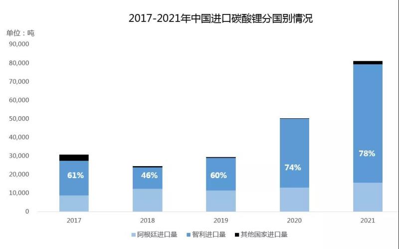 2)海外資源國有化將提升當地資源定價權,獲得了資源收益的更大話語權和支配權。而根據統(tǒng)計,2021年中國進口鹽湖提鋰中,78%進口量來自智利,那么未來中國企業(yè)進口鋰產品成本或將受到掣肘。