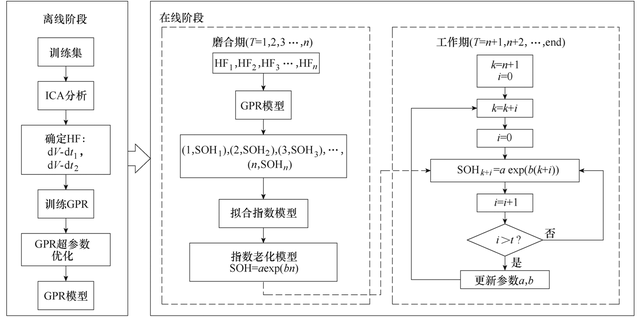 該方法分為離線與在線兩個(gè)階段。在離線階段,通過電池容量增量分析,提取與SOH相關(guān)性較高的兩個(gè)電壓升片段下所耗的時(shí)間dV-dt1與dV-dt2作為外部健康特征,并使用高斯過程回歸的方法對電池SOH的衰退進(jìn)行建模。將在線階段分為兩部分,在“磨合期”通過GPR模型對電池前部分周期的SOH進(jìn)行預(yù)測,利用預(yù)測所得數(shù)據(jù)擬合指數(shù)模型,得到指數(shù)模型參數(shù)的初值;在“工作期”使用指數(shù)模型進(jìn)行SOH預(yù)測,并利用觀測器每隔固定循環(huán)次數(shù)對指數(shù)模型的參數(shù)進(jìn)行修正。