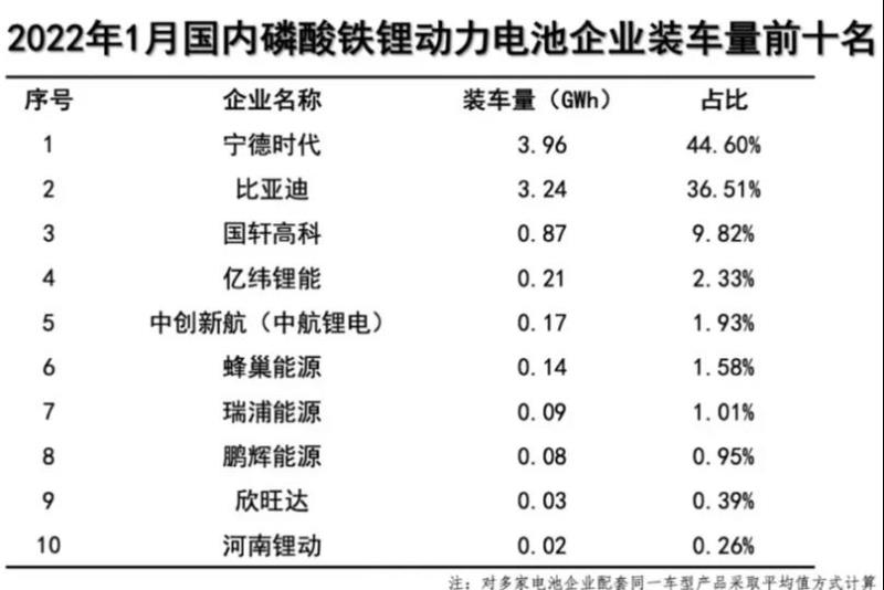 2022年1月,我國磷酸鐵鋰動力電池企業(yè)裝車量前十名分別為:寧德時代、比亞迪、國軒高科、億緯鋰能、中創(chuàng)新航、蜂巢能源、瑞浦能源、鵬輝能源、欣旺達、河南鋰動。