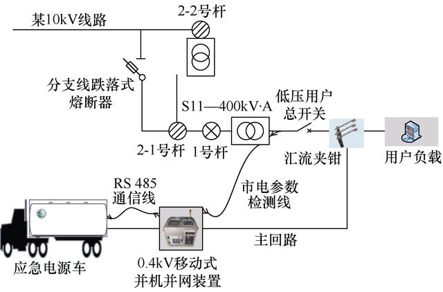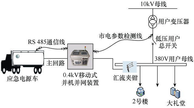 然而,在傳統(tǒng)應(yīng)用模式下,由于多數(shù)0.4kV應(yīng)急電源車并不具備并機并網(wǎng)功能,所以在應(yīng)用中會面對以下幾種情況:①應(yīng)急電源車在接入及退出用戶側(cè)母排時很可能迫使用戶經(jīng)歷多次短時停電;②應(yīng)急電源車的接入只能縮短市電突然掉電期間的用戶停電時間;③在開展不停電更換用戶變壓器等復(fù)雜項目時,應(yīng)急電源車使用受限。