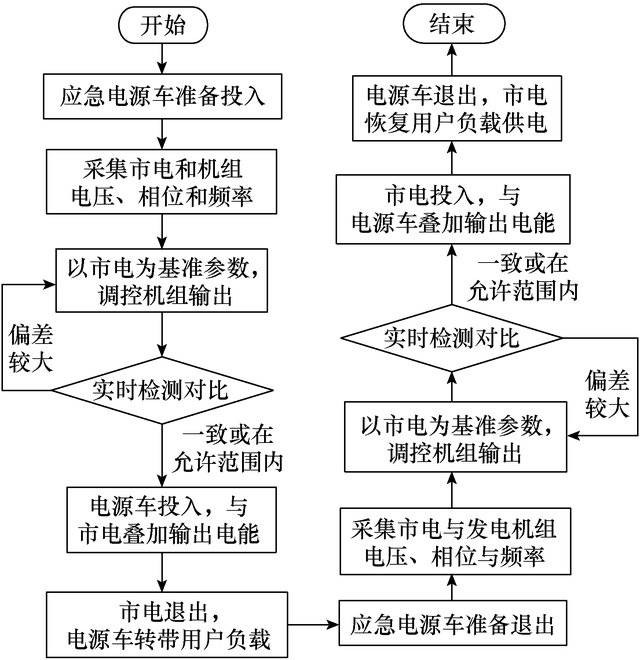 一旦市電突然異?;蚬收鲜щ姡瑒t斷開低壓用戶總開關(guān),由應(yīng)急電源車單獨為用戶負載供電。當(dāng)市電恢復(fù)時,并網(wǎng)裝置一旦檢測到符合并網(wǎng)條件的情況,就會提示現(xiàn)場人員,此時手動合上用戶總開關(guān)。保電工作結(jié)束后,關(guān)停發(fā)電機組并斷開并網(wǎng)開關(guān),然后帶電拆除檢測線和匯流夾鉗。整個供電保障全過程中,實現(xiàn)了用戶無感知用電。