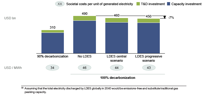 最重要的是,這樣做而無需額外的社會(huì)成本。到2040年,僅在美國(guó)(如圖34所示),在100%的脫碳情景下,電力系統(tǒng)的總體成本每年可減少約350億美元,其中50億美元將來自于輸電和輸配電中的長(zhǎng)時(shí)儲(chǔ)能應(yīng)用擴(kuò)建項(xiàng)目。