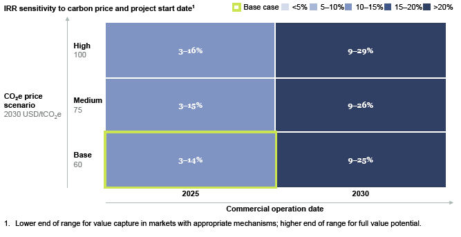 本案例的經(jīng)濟(jì)性對(duì)碳減排價(jià)格和項(xiàng)目開始的日期很敏感。當(dāng)商業(yè)運(yùn)營(yíng)日期移至2030年時(shí),內(nèi)部收益率(IRR)將顯著增加至9%至25%,而長(zhǎng)時(shí)儲(chǔ)能系統(tǒng)的建設(shè)將在前兩年進(jìn)行。此外,加速碳減排價(jià)格上漲可能導(dǎo)致內(nèi)部收益率高達(dá)16%和29%,其運(yùn)營(yíng)日期分別為2025年和2030年(如圖33所示)。