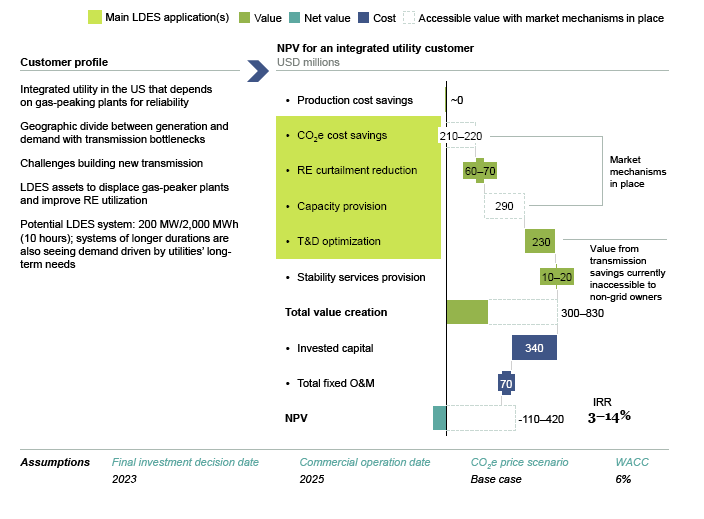 長(zhǎng)時(shí)儲(chǔ)能創(chuàng)造的價(jià)值可以使客戶廣泛受益。以下幾個(gè)客戶業(yè)務(wù)案例說明了一些應(yīng)用程序在不久的將來創(chuàng)造價(jià)值的潛力。而在未來面臨輸電瓶頸的公用事業(yè)公司將從采購(gòu)和部署長(zhǎng)時(shí)儲(chǔ)能中受益,但在貨幣化方面面臨不確定性。