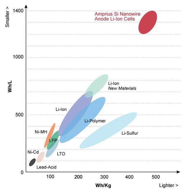 在過(guò)去的幾年中,Amprius研究團(tuán)隊(duì)通過(guò)納米線技術(shù)制成硅陽(yáng)極,并用空心硅納米顆粒逐漸提高了硅陽(yáng)極的耐久性。據(jù)Amprius公司介紹,這款新電池之所以能夠?qū)崿F(xiàn)如此高的能量密度,主要是因?yàn)樵摴緦S械墓杓{米線(Si-Nanowire)技術(shù),直接用100%硅納米線陽(yáng)極取代了傳統(tǒng)的石墨陽(yáng)極。由于硅是能量密度的最佳材料,Amprius的100%硅納米線電池將具有更高的能量密度和功率,并且比一般鋰電池充電速度更快、循環(huán)壽命更長(zhǎng),在美國(guó)國(guó)家實(shí)驗(yàn)室、航空航天公司等的實(shí)際使用中已經(jīng)證明了這一點(diǎn)。