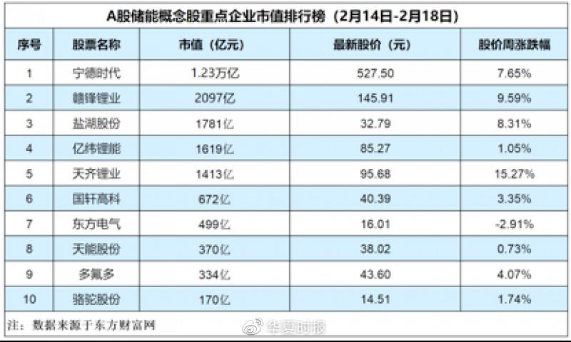 中國儲能網(wǎng)訊:本周(2月14日-2月18日),東方財富儲能概念板塊TOP10幾乎全體上漲,板塊總體也在連續(xù)5周下跌后首次翻紅?!度A夏時報》記者重點監(jiān)測的10家企業(yè)中,有9家上漲,1家下跌。天齊鋰業(yè)周內(nèi)漲幅為15.27%,為TOP10中漲幅最高個股。