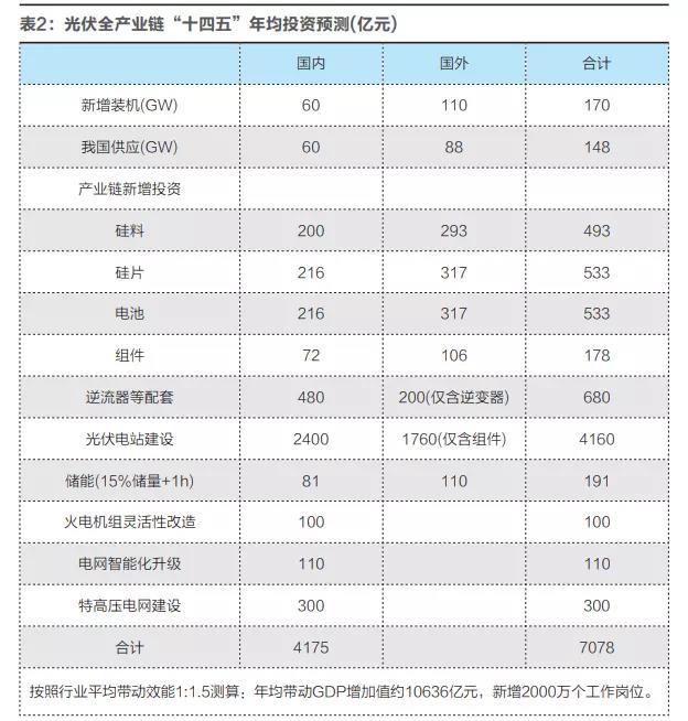 光伏產(chǎn)業(yè)鏈對全社會的貢獻主要表現(xiàn)在對GDP的拉動、解決就業(yè)、上繳稅收和增加外匯。按“十四五”期間我國每年新增裝機60GW,并滿足海外每年新增裝機110GW中80%市場,以2020年GDP100萬億元計,全產(chǎn)業(yè)鏈年均經(jīng)濟增加值約1萬億元,貢獻GDP年增長率6%約1個百分點。