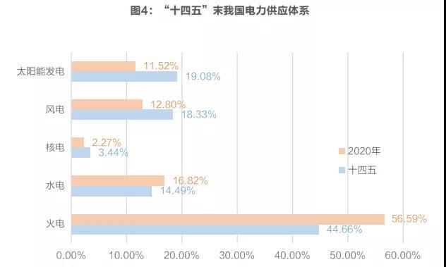 國家發(fā)改委公布2021年新建風電、光伏指導價在30個省市已降至燃煤基準價之下。根據(jù)電力規(guī)劃院數(shù)據(jù),“十四五”期間,風電系統(tǒng)受自然風力分布影響,裝機增速年均為50GW。光伏系統(tǒng)儲備的技術實施路徑基本明晰,主要通過降低原材料成本和提高光電轉化效率兩方面提升競爭力,裝機年均約60GW。