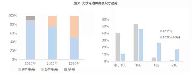 二是以硼為摻雜元素的P型和以磷為摻雜元素的N型的競爭,2020年主流是P型單晶硅片,銷量占比86.9%,但N型單晶硅片具有少子壽命和電池效率更高、溫度系數(shù)低、光衰和弱光性好等優(yōu)點,其中異質(zhì)結和TOPCon電池發(fā)展迅速,有望成為下一代主流技術,預測到2025年占比將超過20%,2030年超過40%。
