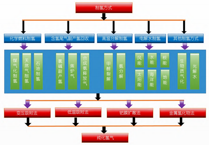 目前有多種制氫的方法, 大體可以分為化學(xué)原料制氫、含氫尾氣副產(chǎn)氫回收、高溫分解制氫、電解水制氫、其他方法制氫等5大類, 并經(jīng)過變壓吸附、低溫吸附、鈀膜擴(kuò)散法、金屬氫化物等方法分離提純獲得所需要純度的氫氣, 如圖1所示。