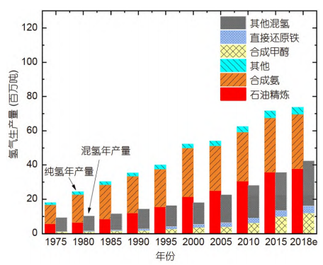 圖2顯示了世界純氫和混氫生產(chǎn)的年度變化純氫是經(jīng)過了分離和純化的氫氣, 混氫則含有一定量的伴生氣體, 且未經(jīng)分離和提純。純氫生產(chǎn)主要用于石油化工、氨合成、燃料電池等, 混氫主要用于甲醇合成、直接還原鐵生產(chǎn)以及其他領(lǐng)域。2018年, 全球純氫生產(chǎn)量為7400萬噸, 混氫生產(chǎn)量為4200萬噸, 合計(jì)11600萬噸。