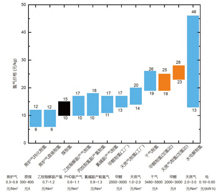 在氫能產(chǎn)業(yè)發(fā)展初期, 我國(guó)宜依托化工生產(chǎn)過程的氫氣或副產(chǎn)氫作為主供氫源, 以節(jié)省制氫投資, 降低成本, 助力氫能產(chǎn)業(yè)起步。圖3是不同制氫方法的氫氣價(jià)格與主要原材料價(jià)格關(guān)系。電解水制氫的氫氣價(jià)格隨著電價(jià)從13元/kg增長(zhǎng)到46元/kg, 增幅約2.5倍, 采用廉價(jià)的電力制氫成本與煤炭和天然氣制氫成本相當(dāng), 具有相當(dāng)?shù)母?jìng)爭(zhēng)優(yōu)勢(shì)。