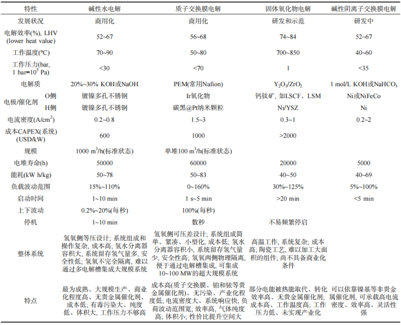 根據(jù)使用電解質(zhì)的不同, 電解水的方式可分為堿性水電解(alkaline, ALK)、質(zhì)子交換膜電解(proton exchange membrane, PEM)、固體氧化物電解(solid oxide electrolysis cell, SOEC)、堿性陰離子交換膜電解 (alkaline anion exchange membrane, AEM)等4種, 基本性能參數(shù)對(duì)比見表1。AEM目前處于初步探索階段; 關(guān)于SOEC, 由于環(huán)境的特殊性和公用工程條件的 局限性, 高溫水蒸氣電解制氫產(chǎn)業(yè)難以實(shí)施; 相對(duì)來說, 堿性電解槽制氫和質(zhì)子交換膜電解制氫較方便實(shí)施。