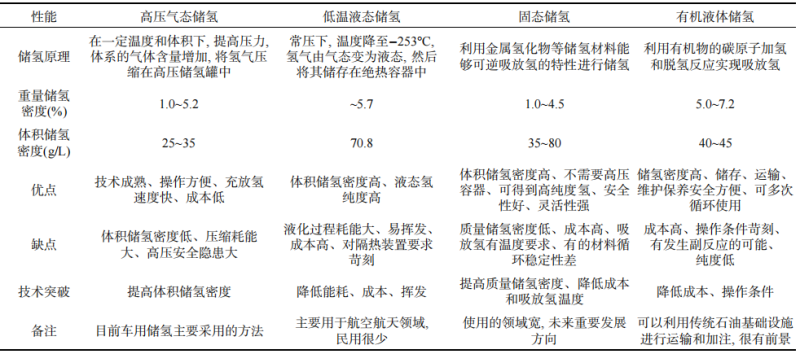 將來的制氫方向是電解水制氫, 而氫氣的儲(chǔ)運(yùn)沒有一個(gè)最好的方法, 只能選擇與應(yīng)用相應(yīng)的最佳方法。氫氣的儲(chǔ)存主要有高壓氣態(tài)儲(chǔ)氫、低溫液態(tài)儲(chǔ)氫、固儲(chǔ)氫和有機(jī)液體儲(chǔ)氫四大類, 各自的特點(diǎn)如表2所示。高壓氣態(tài)儲(chǔ)氫、低溫液態(tài)儲(chǔ)氫和有機(jī)液體儲(chǔ)氫具有容量高的優(yōu)勢(shì), 適合大型氫氣儲(chǔ)運(yùn), 但是分別對(duì)應(yīng)著安全隱患大、能源效率低和純度低等問題; 固態(tài)儲(chǔ)氫的重量?jī)?chǔ)氫密度低, 但是體積儲(chǔ)氫密度高、安全性好、純度高。根據(jù)應(yīng)用場(chǎng)合的需要, 選擇適當(dāng)?shù)臍錃鈨?chǔ)運(yùn)方式。