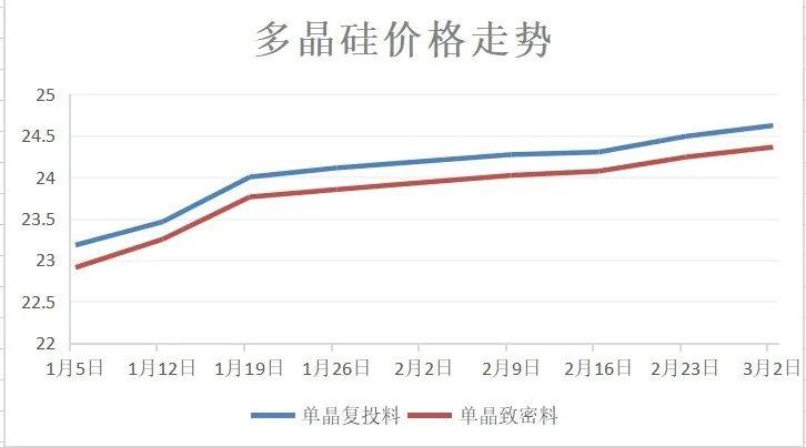 與年初相比,國內(nèi)多晶硅的最新成交均價(jià)上漲均超過1萬元/噸——單晶復(fù)投料成交均價(jià)較年初增加1.44萬元/噸,漲幅6.21%;單晶致密料成交均價(jià)較年初增加1.46萬元/噸,漲幅6.37%。
