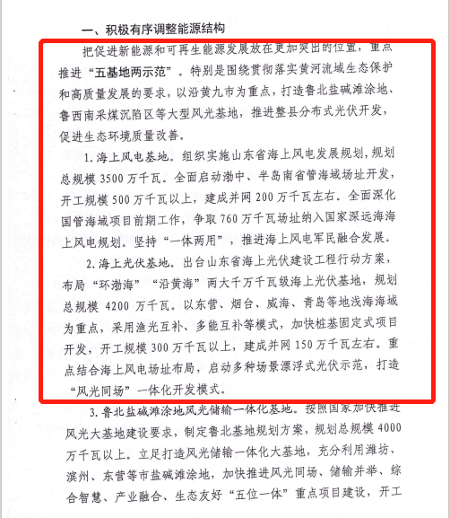 ——海上風(fēng)電基地。組織實(shí)施山東省海上風(fēng)電發(fā)展規(guī)劃,規(guī)劃 總規(guī)模3500萬(wàn)千瓦。全面啟動(dòng)渤中、半島南省管海域場(chǎng)址開(kāi)發(fā),開(kāi)工規(guī)模500萬(wàn)千瓦以上,建成并網(wǎng)200萬(wàn)千瓦左右。全面深化 國(guó)管海域項(xiàng)目前期工作,爭(zhēng)取760萬(wàn)千瓦場(chǎng)址納入國(guó)家深遠(yuǎn)海海 上風(fēng)電規(guī)劃。堅(jiān)持"一體兩用",推進(jìn)海上風(fēng)電軍民融合發(fā)展。