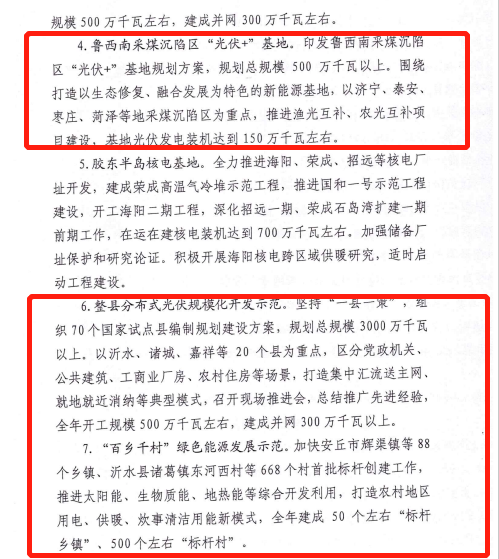——整縣分布式光伏規(guī)?;_(kāi)發(fā)示范。堅(jiān)持"一縣一策",組 織70個(gè)國(guó)家試點(diǎn)縣編制規(guī)劃建設(shè)方案,規(guī)劃總規(guī)模3000萬(wàn)千瓦以上。以沂水、諸城、嘉祥等20個(gè)縣為重點(diǎn),區(qū)分黨政機(jī)關(guān)、公共建筑、工商業(yè)廠房、農(nóng)村住房等場(chǎng)景,打造集中匯流送主網(wǎng)、就地就近消納等典型模式,召開(kāi)現(xiàn)場(chǎng)推進(jìn)會(huì),總結(jié)推廣先進(jìn)經(jīng)驗(yàn), 全年開(kāi)工規(guī)模500萬(wàn)千瓦左右,建成并網(wǎng)300萬(wàn)千瓦以上。