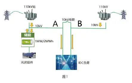 2.架構(gòu)規(guī)劃:本項(xiàng)目?jī)?chǔ)能容量規(guī)模為1MW/2MWh,蓄電池在集裝箱式儲(chǔ)能站集中布置,通過(guò)逆變、升壓后,通過(guò)新增的10kV環(huán)網(wǎng)柜,接入數(shù)據(jù)中心園區(qū)用戶側(cè)10kV母線。其中PCS(儲(chǔ)能變流器)是儲(chǔ)能系統(tǒng)中的核心設(shè)備,將蓄電池簇的直流電逆變?yōu)槿嗾医涣麟?輸出符合電網(wǎng)要求的電能,通過(guò)母排與升壓變壓器連接,在儲(chǔ)能站就地升壓為10kV。在園區(qū)10kV進(jìn)線處安裝逆功率保護(hù)器防止向電網(wǎng)側(cè)反向供電(見(jiàn)圖1)。