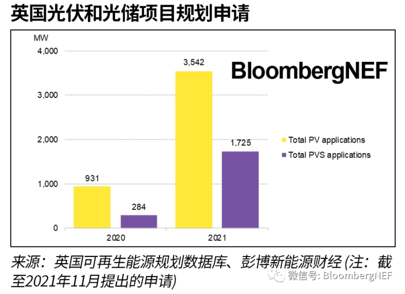 到目前為止,英國(guó)擁有歐洲一半的此類已投運(yùn)項(xiàng)目,并且也是規(guī)劃項(xiàng)目數(shù)量增長(zhǎng)最快的國(guó)家。2021年,英國(guó)容量約1,725MW的光伏項(xiàng)目規(guī)劃申請(qǐng)包含儲(chǔ)能電池,占去年總體光伏項(xiàng)目申請(qǐng)容量的近一半。其中部分申請(qǐng)可能是投機(jī)性的,或者是為了現(xiàn)在獲得規(guī)劃許可,以便晚些時(shí)候再裝機(jī)。然而,開發(fā)商顯然已有這樣做的意愿。