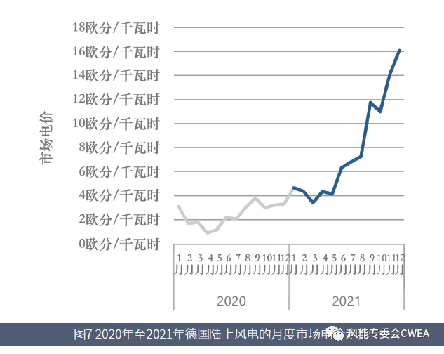 2020年,受新冠肺炎疫情影響,德國電力交易所的陸上風電月度市場電價大幅下降。2021年上半年的電價水平與此基本持平,但下半年開始迅速回升,至12月更是創(chuàng)下歷史新高,達到16歐分/千瓦時(約合人民幣1.14元/千瓦時)。全年,德國陸上風電的成交量加權(quán)平均月度市場電價(volume-weighted average monthly market value)為7.85歐分/千瓦時,較2020年暴漲229%。CWEA