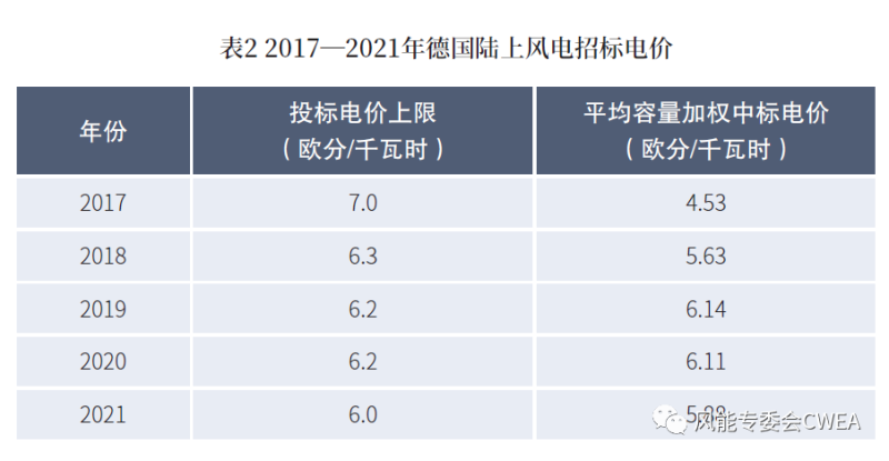 表2 2017—2021年德國陸上風電招標電價