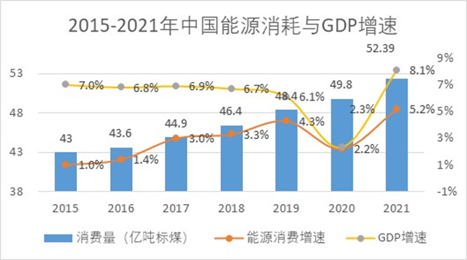而從近幾年經(jīng)濟、能源發(fā)展態(tài)勢來看,我國能耗總量仍處于較快增長通道,單位GDP能耗降低速度也逐步縮?。ㄈ鐖D1)。如果我國產(chǎn)業(yè)結(jié)構(gòu)不發(fā)生質(zhì)的調(diào)整,經(jīng)濟發(fā)展速度不論快慢,都會伴隨著能耗的較大幅度增長:經(jīng)濟較快增長階段,由于能耗強度降低趨緩,能耗增速將超預期,如2021年能耗增長5.2%,強度降低僅2.7%,低于“十四五”期間設定的平均值;而經(jīng)濟增長乏力階段,國家將出臺工業(yè)穩(wěn)增長的政策,基建投資必然重啟,其能耗增速仍將保持一定水平,如2020年。而由于非化石能源基數(shù)太小,單位能耗排放強度仍未實質(zhì)性改善,化石能源增長仍帶來能源使用排放的較大增加。