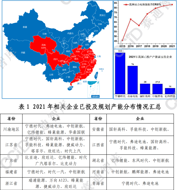 我國動力電池產(chǎn)業(yè)集中度快速提升。依托市場和資源稟賦,電池企業(yè)主要分布在東南沿海、華中以及川渝地區(qū),區(qū)域集群顯著。電池產(chǎn)能亦呈現(xiàn)較高集中度,TOP5頭部效應(yīng)明顯
