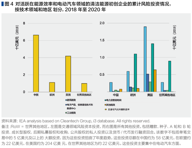 對(duì)能源效率和電動(dòng)出行初創(chuàng)企業(yè)的風(fēng)險(xiǎn)投資集中在世界幾個(gè)地方。在2018-2020年期間,總部設(shè)在美國(guó)的公司吸引了約40%的此類融資,其次是中國(guó)(30%)和歐盟(10%)(不包括單輪5億美元或以上的大型交易,因?yàn)檫@些交易可能掩蓋基本趨勢(shì))。在中國(guó)和美國(guó),圍繞交通領(lǐng)域電動(dòng)化的投資活動(dòng)十分活躍,中國(guó)從2015年左右開始受益于有針對(duì)性的支持,美國(guó)則有一系列超過10億美元的交易記錄。相比之下,建筑、電力和工業(yè)在全球范圍內(nèi)吸引的能效風(fēng)險(xiǎn)投資要少得多,而且在這些部門實(shí)現(xiàn)凈零排放的目標(biāo)方面還有許多技術(shù)創(chuàng)新的差距和機(jī)會(huì)。