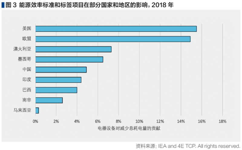 在有數(shù)據(jù)可查的九個(gè)國(guó)家和地區(qū)中,效率標(biāo)準(zhǔn)和標(biāo)簽減少的電力需求量,相當(dāng)于風(fēng)能和太陽(yáng)能的總發(fā)電量。這些標(biāo)準(zhǔn)在歐盟和美國(guó)實(shí)施的時(shí)間更長(zhǎng),但中國(guó)正在迎頭趕上。在中國(guó),標(biāo)準(zhǔn)的實(shí)施已經(jīng)幫助每年避免了全國(guó)總電力消耗的5%左右,每年減少 8000萬(wàn)噸的二氧化碳排放。隨著舊設(shè)備被更高效的設(shè)備所取代,這些節(jié)約將越來越多,盡管標(biāo)準(zhǔn)需要不斷提高以優(yōu)化節(jié)能。