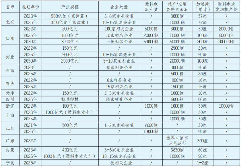從主要省市區(qū)氫能產(chǎn)業(yè)發(fā)展規(guī)劃所制定的目標(biāo)可以清晰地看出,燃料電池汽車(chē)及其產(chǎn)業(yè)鏈?zhǔn)歉鞯匕l(fā)展氫能的主因,甚至是唯一選擇。表1中列舉的13個(gè)省市自治區(qū)中,除了寧夏以外,其余省市自治區(qū)的氫能產(chǎn)業(yè)規(guī)劃都具體為氫燃料電池汽車(chē)的生產(chǎn)或推廣目標(biāo),其中還有兩個(gè)?。ㄉ綎|和浙江)規(guī)劃了氫燃料電池發(fā)動(dòng)機(jī)產(chǎn)能目標(biāo)。對(duì)于氫能在其他領(lǐng)域的應(yīng)用則沒(méi)有涉及。