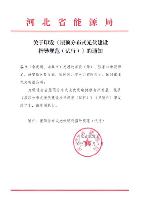中國儲能網(wǎng)訊:3月16日,河北省能源局發(fā)布《屋頂分布式光伏建設(shè)指導(dǎo)規(guī)范(試行)》的通知。根據(jù)文件,本規(guī)范規(guī)定了屋頂分布式光伏項目工作流程、規(guī)劃要求、項目立項、本體設(shè)計、接網(wǎng)設(shè)計、工程建設(shè)、并網(wǎng)調(diào)試、工程驗收、調(diào)控與保護(hù)、運行維護(hù)、交易結(jié)算、用電監(jiān)察、項目評價等應(yīng)遵循的基本要求。