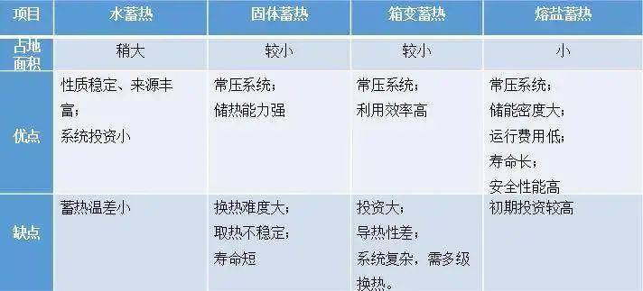 熔鹽蓄熱供暖系統(tǒng)與水蓄熱、固體蓄熱、箱變蓄熱對(duì)比,綜合占地面積、系統(tǒng)安全、使用壽命、儲(chǔ)能密度等因素考慮,占有明顯優(yōu)勢(shì),詳見表1。