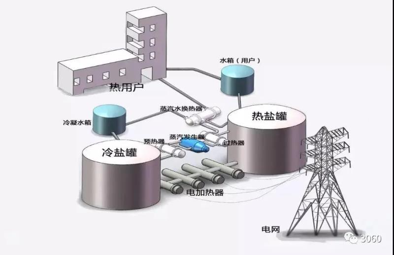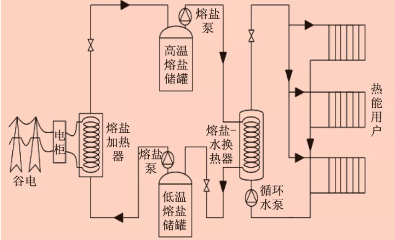 熔鹽儲(chǔ)能技術(shù)可實(shí)現(xiàn)谷電蓄熱,熔鹽儲(chǔ)能供暖系統(tǒng)原理如下圖。在夜間谷電時(shí)段,熔鹽泵將低溫熔鹽儲(chǔ)罐內(nèi)冷熔鹽輸送至熔鹽加熱器,利用谷電加熱,并在高溫儲(chǔ)罐中存儲(chǔ),在日間用熱時(shí)段,高溫熔鹽被熔鹽泵抽出,流入熔鹽-水換熱器。市政用水在換熱器中與高溫熔鹽換熱成為熱水,為住宅小區(qū)供給熱能或熱水。系統(tǒng)內(nèi)熔鹽降溫后流回低溫熔鹽儲(chǔ)罐。
