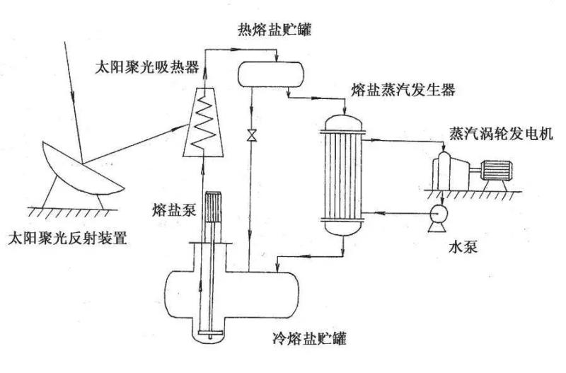 熔鹽是指熔融態(tài)下的液體鹽,工程中使用的熔鹽通常指無機(jī)鹽熔融體。熔鹽具有高沸點(diǎn)、低粘度、低蒸汽壓力和高體積熱的特點(diǎn),是一種優(yōu)良的傳熱儲(chǔ)熱介質(zhì)。熔鹽儲(chǔ)能技術(shù)即利用熔鹽在升溫和降溫過程中的溫差實(shí)現(xiàn)熱能存儲(chǔ)。