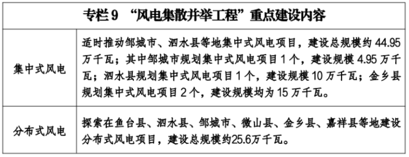 風(fēng)電方面:集散有序推進(jìn)風(fēng)力發(fā)電。加強(qiáng)陸地風(fēng)能資源管理,依托鄒城、泗水已建成風(fēng)電站的經(jīng)驗(yàn),考慮生態(tài)紅線、用地等因素,在鄒城、泗水等山區(qū)適時(shí)推動(dòng)集中式風(fēng)電工程建設(shè),探索在魚臺(tái)、泗水、鄒城、微山、金鄉(xiāng)、嘉祥等平原地區(qū)推進(jìn)分布式風(fēng)電項(xiàng)目,集散有序推進(jìn)風(fēng)力發(fā)電,逐步增加風(fēng)電規(guī)模。到2025年,建成、在建風(fēng)電裝機(jī)總量力爭達(dá)到95萬千瓦左右。