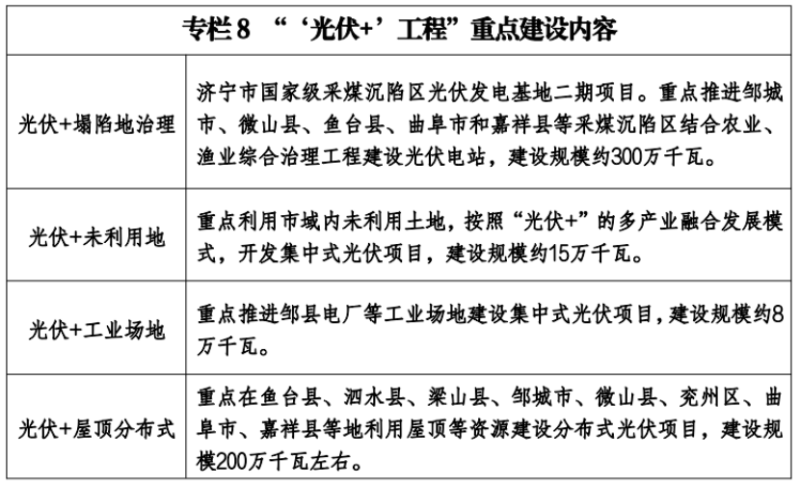 集中式光伏。重點(diǎn)深耕“光伏+塌陷地治理”基地。聚焦光伏和生態(tài)修復(fù)融合發(fā)展,重點(diǎn)推進(jìn)鄒城市、微山縣、魚臺(tái)縣、曲阜市和嘉祥縣等采煤沉陷區(qū)結(jié)合農(nóng)業(yè)、漁業(yè)綜合治理工程建設(shè)光伏電站,大力推動(dòng)濟(jì)寧市國家級(jí)采煤沉陷區(qū)光伏發(fā)電基地二期建設(shè),鼓勵(lì)新增塌陷地光伏+同步治理模式。積極推動(dòng)“光伏+未利用地”融合發(fā)展模式。充分挖掘濟(jì)寧市行政區(qū)域內(nèi)未利用土地資源,結(jié)合生態(tài)修復(fù)、鄉(xiāng)村振興,采用“光伏+”多產(chǎn)業(yè)融合發(fā)展模式,開發(fā)一批集中式光伏項(xiàng)目。積極發(fā)展“光伏+工業(yè)用地”集中式發(fā)電。支持能源企業(yè)利用自有工業(yè)場地、園區(qū),積極發(fā)展集中式光伏。