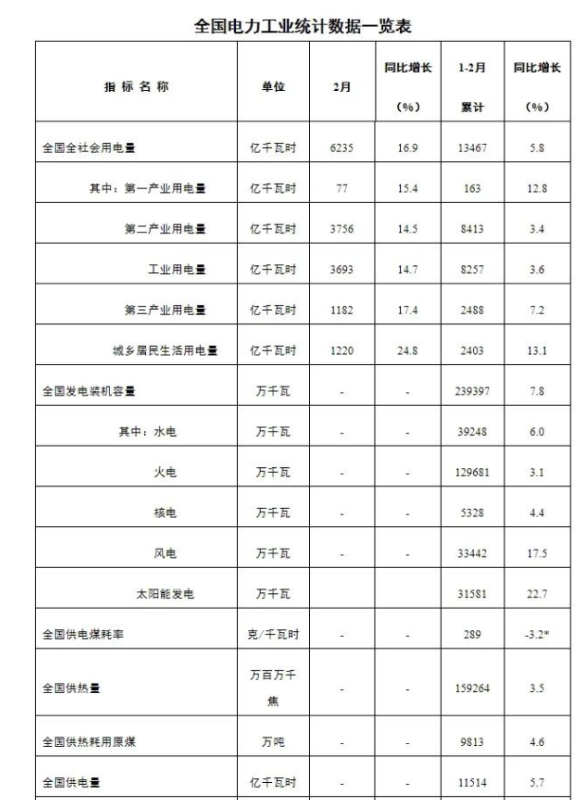 3月21日,國家能源局發(fā)布1-2月份全國電力工業(yè)統(tǒng)計數(shù)據(jù)。截至2月底,全國發(fā)電裝機容量約23.9億千瓦,同比增長7.8%。其中,風(fēng)電裝機容量約3.3億千瓦,同比增長17.5%;太陽能發(fā)電裝機容量約3.2億千瓦,同比增長22.7%。