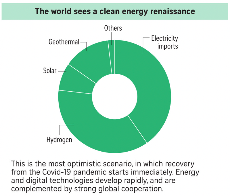 在最樂觀的情況下,能源和數(shù)字技術(shù)發(fā)展迅速,并輔之以強(qiáng)有力的全球合作。這使新加坡能夠在2050年實(shí)現(xiàn)多樣化的能源供應(yīng)組合,有能力從多個(gè)國(guó)家進(jìn)口能源,并將低碳?xì)溆米麝P(guān)鍵能源。第二種情況假設(shè)COVID-19復(fù)蘇的路徑更長(zhǎng),推遲投資到清潔能源技術(shù),導(dǎo)致新的發(fā)展停滯。在這種情況下,天然氣仍然是新加坡能源結(jié)構(gòu)的重要組成部分,排放量通過從其他地方購(gòu)買碳信用額度來(lái)抵消。