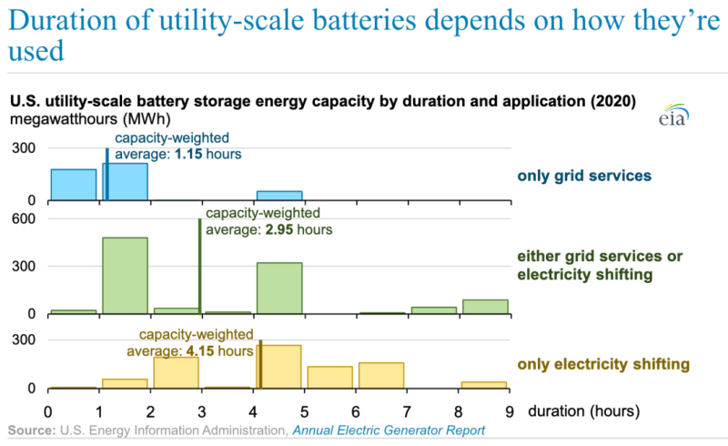 用于電網(wǎng)服務(wù)的電池平均持續(xù)時間相對較短(電池的平均持續(xù)時間是指電池在其銘牌功率容量下提供電能直至耗盡的時間);用于電力負(fù)荷轉(zhuǎn)移的電池持續(xù)時間相對較長。持續(xù)時間少于兩小時的電池被視為短時間電池,幾乎所有電池都可以提供有助于維持電網(wǎng)穩(wěn)定的電網(wǎng)服務(wù)。提供電網(wǎng)服務(wù)的電池會在短時間內(nèi)放電,有時甚至只有幾秒鐘或幾分鐘。部署短時儲能電池具有經(jīng)濟(jì)性,2010年代末安裝的大多數(shù)電池容量由用于電網(wǎng)服務(wù)的短時儲能電池組成。但隨著時間的推移,這種趨勢正在改變。