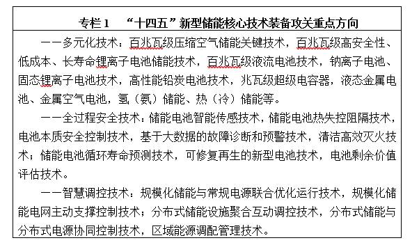 新型儲(chǔ)能關(guān)鍵技術(shù)研發(fā)是先決條件,在《實(shí)施方案》中,技術(shù)創(chuàng)新被提到前所未有的高度,在六大重大任務(wù)方向中排在首位,這六大任務(wù)方向包括:技術(shù)創(chuàng)新、試點(diǎn)示范、規(guī)模發(fā)展、體制機(jī)制、政策保障、國(guó)際合作。《實(shí)施方案》強(qiáng)調(diào)對(duì)新型儲(chǔ)能技術(shù)創(chuàng)新要加強(qiáng)戰(zhàn)略性布局和系統(tǒng)性謀劃,專欄1中列出了“十四五”新型儲(chǔ)能核心技術(shù)裝備攻關(guān)重點(diǎn)方向,從推動(dòng)多元化技術(shù)開發(fā)、突破全過(guò)程安全技術(shù)、創(chuàng)新智慧調(diào)控技術(shù)三個(gè)層面來(lái)部署,以集中技術(shù)攻關(guān),并提出研發(fā)的儲(chǔ)備技術(shù)方向,鼓勵(lì)不同技術(shù)路線“百花齊放”,同時(shí)兼顧創(chuàng)新資源的優(yōu)化配置。