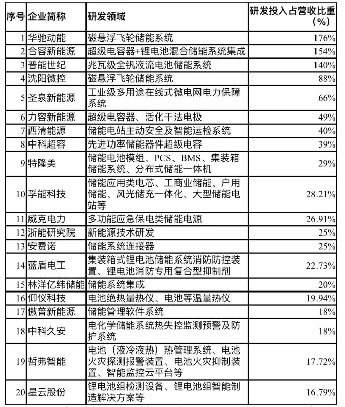 表1 2021年度儲(chǔ)能企業(yè)R&D投入強(qiáng)度TOP20一覽表