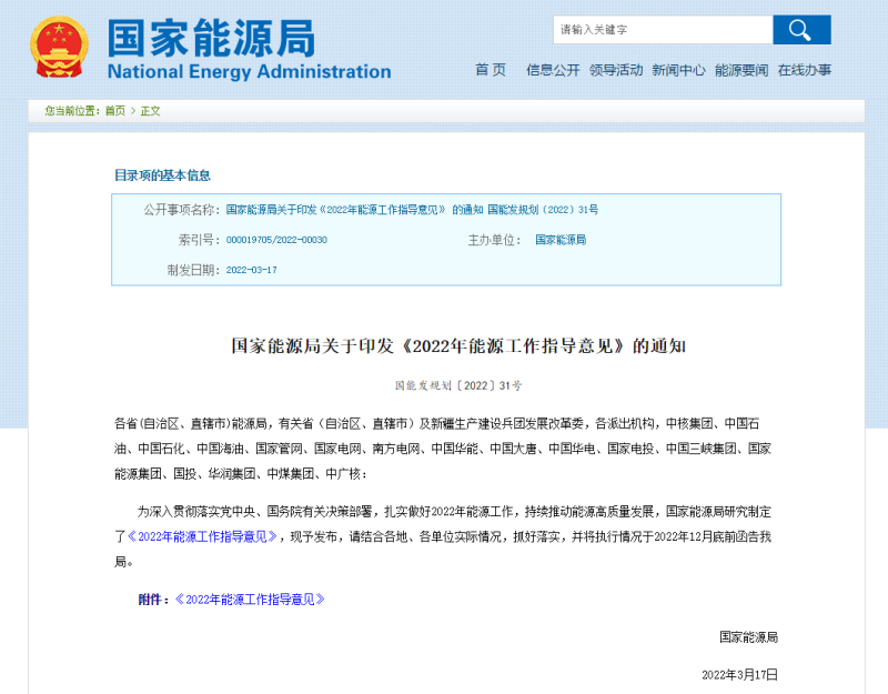 國(guó)家能源局關(guān)于印發(fā)《2022年能源工作指導(dǎo)意見》的通知