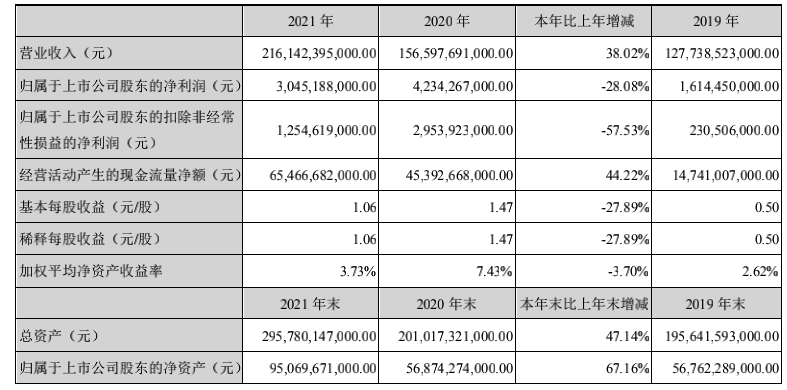 中國儲(chǔ)能網(wǎng)訊:3月29日晚間,比亞迪(002594.SZ)對(duì)外發(fā)布的2021年全年業(yè)績(jī)報(bào)告顯示,公司2021年實(shí)現(xiàn)營業(yè)收入約2161.42億元,同比增長(zhǎng)38.02%;歸屬于上市公司股東的凈利潤盈利約為30.45億元,同比減少28.08%。