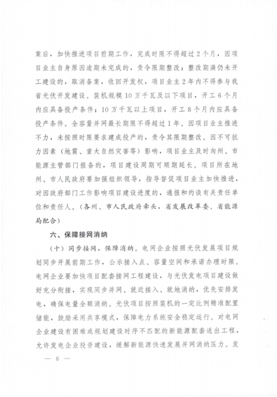 (九)推動項(xiàng)目加快建設(shè),限期投產(chǎn)。各州、市人民政府應(yīng)督促項(xiàng)目業(yè)主在取得開發(fā)權(quán)后,1個(gè)月內(nèi)完成項(xiàng)目備案。完成備案后,加快推進(jìn)項(xiàng)目前期工作,完成時(shí)限不得超過2個(gè)月,因項(xiàng)目業(yè)主自身原因逾期未完成的,責(zé)令限期整改;整改期滿仍未開工建設(shè)的,取消備案,收回開發(fā)權(quán),項(xiàng)目業(yè)主2年內(nèi)不得參與我省光伏開發(fā)建設(shè)。裝機(jī)規(guī)模10萬千瓦及以下項(xiàng)目,開工6個(gè)月內(nèi)應(yīng)具備投產(chǎn)條件;10萬千瓦以上項(xiàng)目,開工8個(gè)月內(nèi)應(yīng)具備投產(chǎn)條件。全容量并網(wǎng)最長期限不得超過1年。因項(xiàng)目業(yè)主推進(jìn)不力,未按照時(shí)限要求建成投產(chǎn)的,責(zé)令其限期整改。因不可抗力因素(地震、重大自然災(zāi)害等)影響,項(xiàng)目業(yè)主及時(shí)向州、市能源主管部門報(bào)備的,項(xiàng)目建設(shè)周期可順期延長。項(xiàng)目所在地州、市人民政府要加強(qiáng)組織領(lǐng)導(dǎo),指導(dǎo)督促項(xiàng)目業(yè)主加快推進(jìn),對因政府部門工作影響項(xiàng)目建設(shè)進(jìn)度的,通報(bào)和約談有關(guān)責(zé)任單位和責(zé)任人。(各州、市人民政府牽頭;省發(fā)展改革委、省能源局配合)