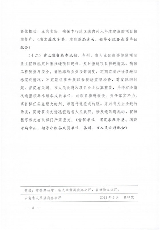 (十一)完善統(tǒng)籌協(xié)調(diào)機(jī)制。充分發(fā)揮云南省可再生能源發(fā)展和煤電改造升級協(xié)調(diào)工作領(lǐng)導(dǎo)小組(以下簡稱領(lǐng)導(dǎo)小組)作用,統(tǒng)籌推進(jìn)全省光伏項(xiàng)目建設(shè),協(xié)調(diào)解決項(xiàng)目建設(shè)中存在的困難和問題。省發(fā)展改革委負(fù)責(zé)不定期組織研究項(xiàng)目實(shí)施過程中的重大問題。省能源局履行領(lǐng)導(dǎo)小組辦公室職責(zé),強(qiáng)化上下聯(lián)動與左右協(xié)同,加強(qiáng)日常動態(tài)跟蹤與監(jiān)管,每月定期召開領(lǐng)導(dǎo)小組辦公室會議,每月牽頭組織對各地在建項(xiàng)目投資進(jìn)度進(jìn)行排序,每10天進(jìn)行1次調(diào)度,對投資進(jìn)度連續(xù)3個(gè)月排名靠前的進(jìn)行通報(bào)表揚(yáng);對年度完成投資靠前的,將區(qū)域內(nèi)次年計(jì)劃新開工項(xiàng)目優(yōu)先納入省級重大項(xiàng)目。省自然資源廳負(fù)責(zé)項(xiàng)目用地指標(biāo)保障,加快土地調(diào)規(guī)與使用土地行政審批。省生態(tài)環(huán)境廳指導(dǎo)加快項(xiàng)目環(huán)境影響評價(jià)行政審批。省水利廳負(fù)責(zé)加快水土保持方案行政審批。省林草局負(fù)責(zé)項(xiàng)目用林指標(biāo)保障、使用林地行政審批。領(lǐng)導(dǎo)小組各成員單位要按照職責(zé)分工做好工作配合。有關(guān)州、市人民政府成立工作領(lǐng)導(dǎo)小組,建立統(tǒng)籌協(xié)調(diào)機(jī)制,將加快光伏發(fā)電項(xiàng)目建設(shè)納入州、市人民政府重要議事日程,主要領(lǐng)導(dǎo)親自掛帥,高位推動,壓實(shí)責(zé)任,確保本行政區(qū)域內(nèi)列入年度建設(shè)的項(xiàng)目按期投產(chǎn)。(省發(fā)展改革委、省能源局牽頭;領(lǐng)導(dǎo)小組各成員單位配合)