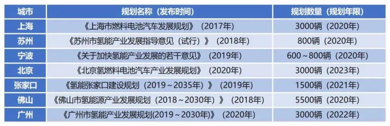 主要城市規(guī)劃推廣燃料電池車目標(biāo) 數(shù)據(jù)來源:各市相關(guān)規(guī)劃