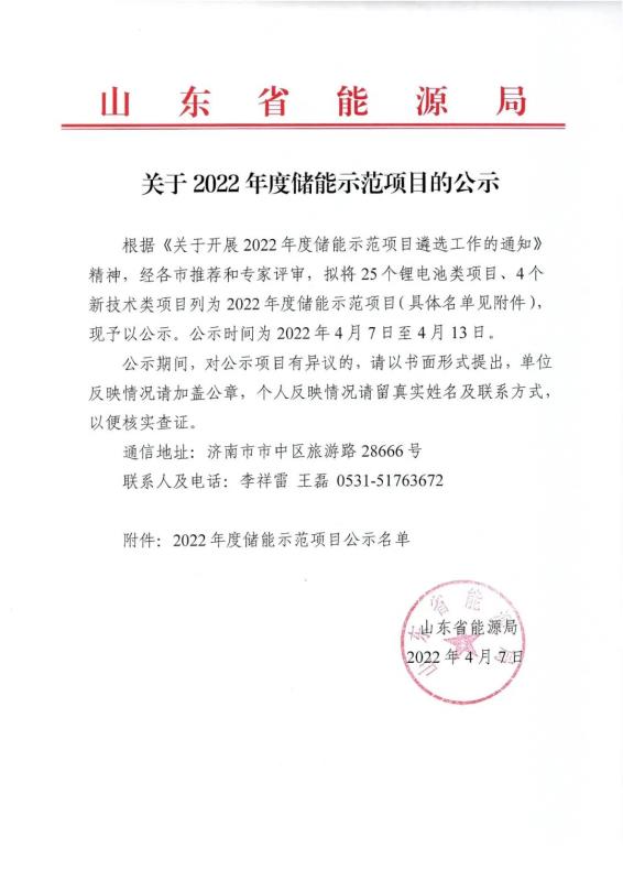 根據(jù)《關(guān)于開展2022年度儲(chǔ)能示范項(xiàng)目遴選工作的通知》精神,經(jīng)各市推薦和專家評(píng)審,擬將25個(gè)鋰電池類項(xiàng)目、4個(gè)新技術(shù)類項(xiàng)目列為2022年度儲(chǔ)能示范項(xiàng)目(具體名單見附件),現(xiàn)予以公示。公示時(shí)間為2022年4月7日至4月13日。