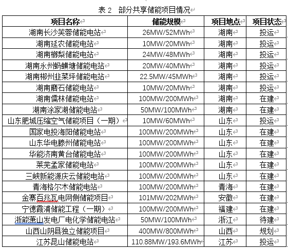 除湖南、山東外,青海、山西、安徽等地也有共享儲(chǔ)能電站處于建設(shè)或開(kāi)發(fā)階段。據(jù)不完全統(tǒng)計(jì),全國(guó)各地已公布的共享儲(chǔ)能電站項(xiàng)目總裝機(jī)規(guī)模已接近10GW/20GWh(部分共享儲(chǔ)能電站項(xiàng)目如表2所示)。