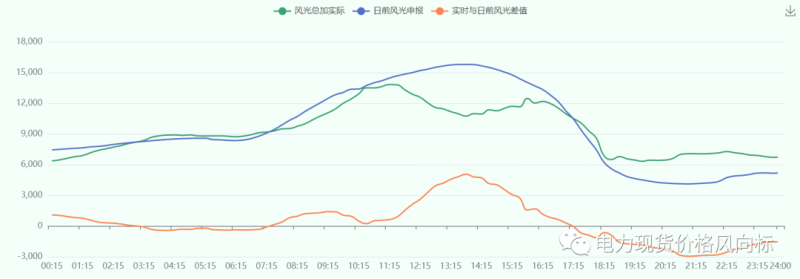 新能源發(fā)電中,風(fēng)電光伏總加日前申報(bào)功率全天平均值為9595.01MW,實(shí)際發(fā)電功率全天平均為9308.28MW。實(shí)時功率和日前申報(bào)功率,全天出現(xiàn)的平均偏差率為3.08%。