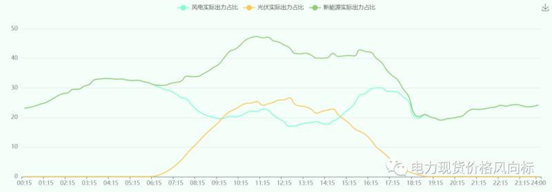全天,新能源出力峰谷差率為2.46。新能源占統(tǒng)調(diào)發(fā)電比重的具體實(shí)時曲線如下圖所示: